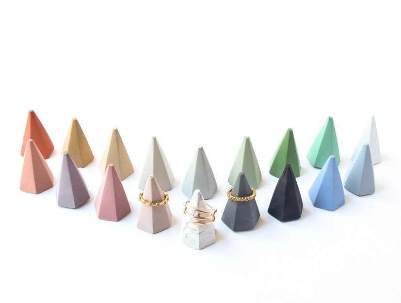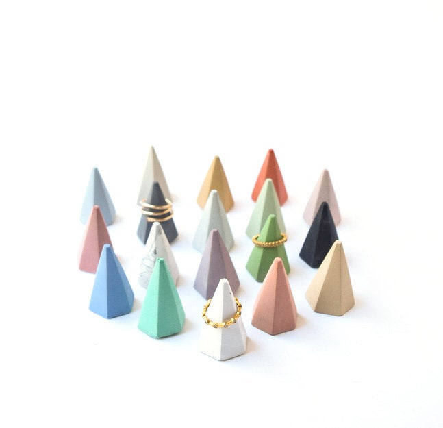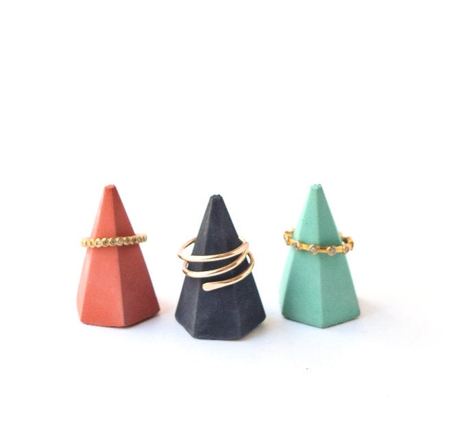 This Concrete Mini Ring Cone is perfect for the bathroom, bedside table, or near the kitchen sink to store your favorite rings. They are tiny (see dimensions below) but absolutely adorable! The modern design is the perfect decorative and functional accent piece. Sold individually or in multiple sets at a discounted price! **For multi-colored sets of two or three, please indicate the colors desired in a note with your order.